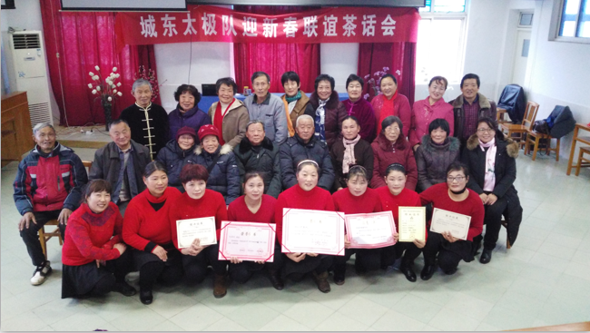 聯(lián)誼會上,太極隊隊長胡建軍發(fā)言說:“城東太極隊在過去的一年里,多次參加射陽縣舉辦的各項中老年人的活動,并屢次獲獎。希望大家在新的一年里,繼續(xù)發(fā)揚團結友愛的精神,齊健身、同歡樂。”