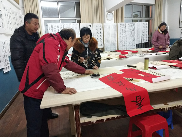 貼春聯(lián)是中華民族的傳統(tǒng)民俗。近日,新洋農(nóng)場書法傳承班的教室里,一場特殊的習(xí)字課正在開展,只見黑板上掛著兩幅墨汁未干的春聯(lián),學(xué)員們在紅紙上認(rèn)真寫著。