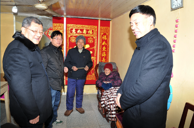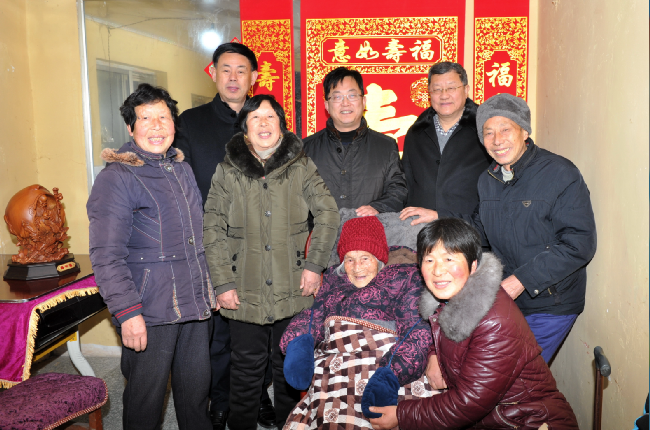 “我們黨政工領(lǐng)導(dǎo)來給您拜年了!”王進強一進門就對坐在沙發(fā)上的百歲老人說。