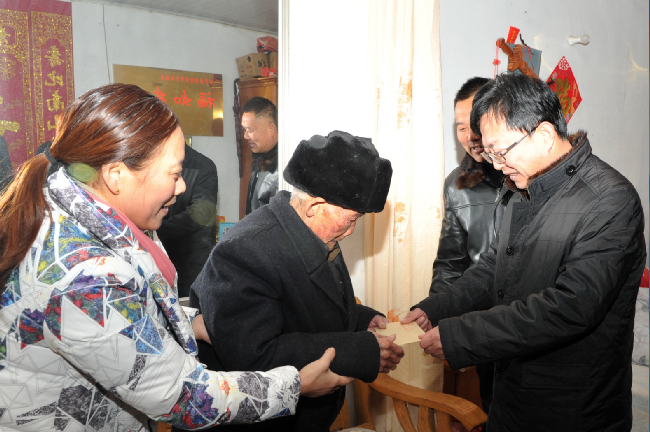“今天我們代表農(nóng)場的黨政工領(lǐng)導(dǎo)一起來慰問百歲老人,祝愿老人福如東海、壽比南山。”王進強一邊把一封裝有慰問金的信封交到老子的兒女手中,一邊熱情地說道。