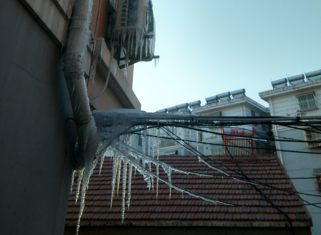 2月4日下午,淮海農(nóng)場城南15號樓樓頂出現(xiàn)自來水泄漏現(xiàn)象,泄漏下來的水流不僅把二樓墻壁上的空調(diào)凍成了冰凌團子,漏下來的水沿著水管四濺,造成二樓的主樓梯口成了水簾洞,臺階也成了易滑跟頭的冰臺階。無論是空調(diào)還是冰臺階甚至高懸在頭頂?shù)谋瑁即嬗袠O大的安全隱患。