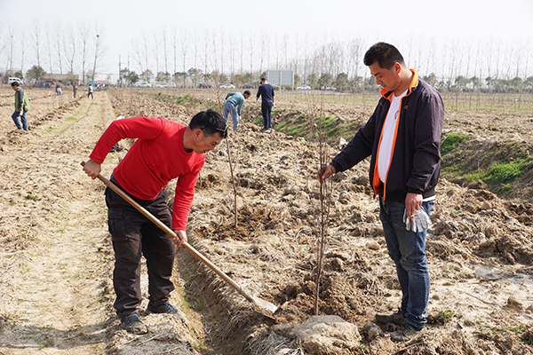 植樹現(xiàn)場,志愿者搬樹苗、鏟土、踩實、圈土,為基地增添新綠。在大家齊心協(xié)力配合下,3600株墨西哥落羽杉樹很快在春風中昂然挺立,在明媚的陽光下透著生機與活力。