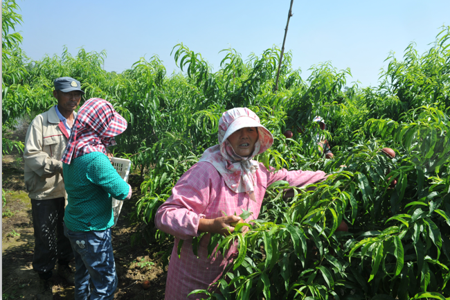 “到農(nóng)場(chǎng)來(lái)干活,距家又不遠(yuǎn),而且常年都有事做,家務(wù)事又不耽擱,每年很輕松收入就近兩萬(wàn)元。”李老漢一邊拎著塑料筐跟在婦女后邊放著桃,一邊跟筆者說(shuō)著。三四年前,李老漢就開始到果園里來(lái)務(wù)工,主要從事果樹的修剪、施肥、疏花、采摘、鋤草、澆水等管理工作。與李老漢那樣,僅新東村在果園常年打工的還有其他10多名村民。