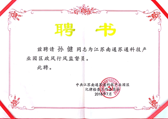 蘇通科技產(chǎn)業(yè)園區(qū)黨工委副書記金志偉充分肯定了南通公司紀(jì)委工作,對墾地廉潔共建和南通公司紀(jì)委工作提出了具體要求。座談會(huì)上,園區(qū)紀(jì)工委向南通公司紀(jì)委書記孫健頒發(fā)了蘇通科技產(chǎn)業(yè)園區(qū)行風(fēng)監(jiān)督員的聘書。