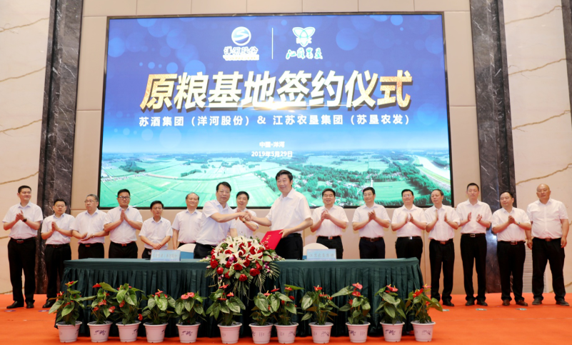 5月29日,江蘇農墾(蘇墾農發)與蘇酒集團(洋河股份)原糧基地簽約儀式在洋河酒廠隆重舉行。集團公司黨委書記、董事長魏紅軍,總經理胡兆輝,蘇酒集團(洋河股份)黨委書記、董事長王耀,蘇酒集團(洋河股份)總裁鐘雨出席活動。中國工程院院士、揚州大學教授張洪程等專家見證此次簽約儀式。