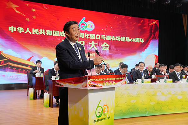 9月23日,在節日般的喜慶氛圍中,白馬湖農場有限公司干部職工代表和特邀嘉賓共450人歡聚一堂召開慶祝大會,共同慶祝中華人民共和國成立70周年暨白馬湖農場建場60周年。集團公司總經理、蘇墾農發董事長胡兆輝,淮安區委書記徐子佳出席并講話,白馬湖農場公司黨委書記、董事長、總經理姚春華致辭,黨委副書記韓正光主持大會。