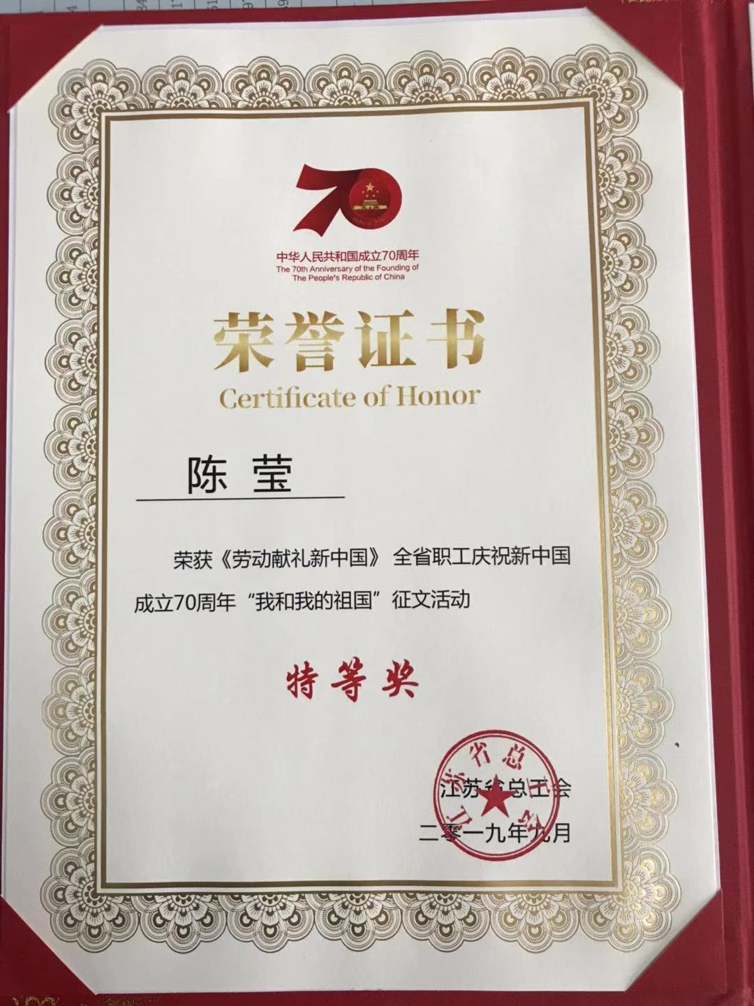 經農墾物業公司工會和集團工會推薦,物業公司職工陳瑩同志以《假如我有一臺時光機》一文參加《勞動獻禮新中國》全省職工慶祝新中國成立70周年“我和我的祖國”征文活動并榮獲特等獎。該活動共收到文稿5204封,特等獎10人,陳瑩代表江蘇農墾獲得榮譽。