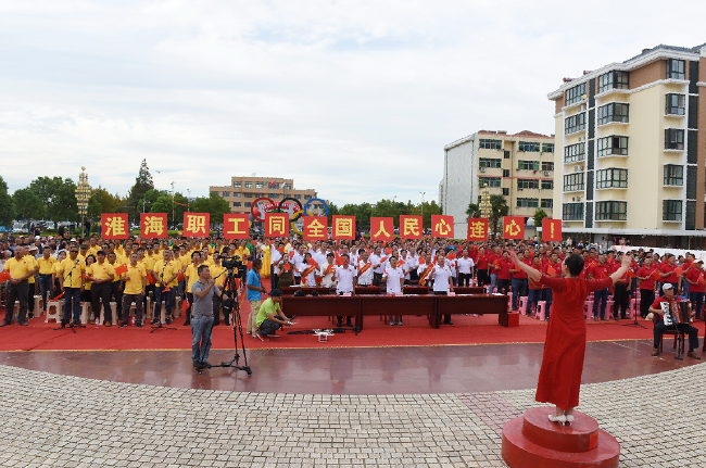 本屆廣場文化節在舞蹈《幸福舞起來》中拉開了帷幕。《祝福祖國》《唱支山歌給黨聽》《為祖國干杯》等一支支舞蹈,演員們以歡快的舞姿,從心底間來祝福農場職工居民蒸蒸日上的新生活;詩朗誦《青春中國》,把共產黨人經歷曲折道路上的艱辛,為了目標和希望那不屈不饒的精神,真情地展示在人們的面前;情景劇《十二人抬橋》展示了農四師老軍工們面對艱難困苦的條件,保持了艱苦創業和團結奮進的英雄氣概,為我們樹立了傳承的榜樣;歌伴舞《人民的好干部——焦裕䘵》,把焦裕䘵以身體力行的姿態和清正廉潔的作風,演繹得淋漓盡致,反映出共產黨人時刻把人民的利益放在首位,踐行著為了人民的錚錚誓言。愛國歌曲《沒有共產黨就沒有新中國》《愛我中華》《我們走在大路上》《我和我的祖國》在四個不同顏色服裝的方陣中一波接著一波地傳唱,揮舞著五星紅旗的方陣,場面氣勢恢宏。最后由335人組成的五個方陣同聲演唱《歌唱祖國》,把文化節活動推向了高潮,特別是演唱席中豎起的“熱烈慶祝新中國成立70周年!”和“淮海職工同全國人民心連心!”紅底黃字的標語,讓大家心潮澎湃,激情滿懷。