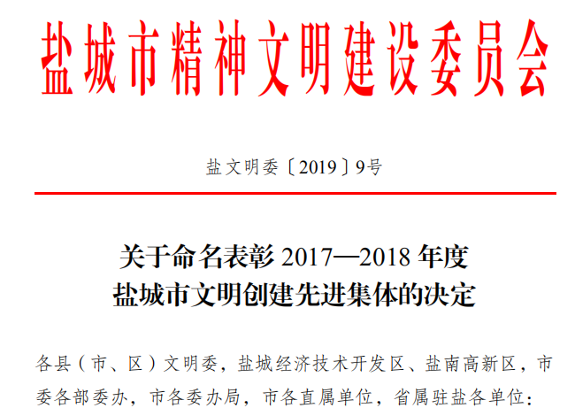 12月7日,淮海農場有限公司被省文明委表彰為2016-2018年江蘇省“文明單位”;在事隔省文明委表彰僅11天的12月18日,農場公司又獲得了市文明委表彰的2017-2018年鹽城市“文明單位”,這兩塊省市文明單位的榮譽也是淮海連續23年不間斷地獲此殊榮。近年來在以習近平新時代中國特色社會主義思想指導下,全面貫徹黨的十九大精神,大力培植社會主義核心價值觀和軍墾文化建設,積極拓展和深化群眾性精神文明創建活動,為構建“實力、創新、和諧、美麗”新淮海提供精神動力和思想保證。