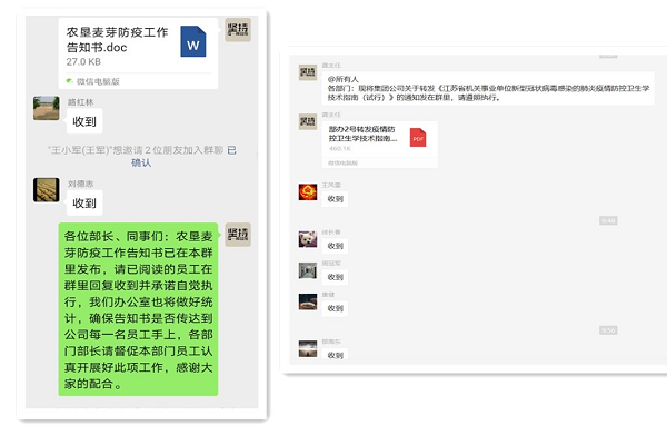 四是做好疫情防控知識宣傳工作,引導員工正確做好個人和家庭自我防護工作。1月29日,制定下發《蘇墾麥芽公司防疫工作告知書》,與172名員工逐一做好聯系確認并承諾執行,引導全體員工增強防范意識,減少人員聚集。同時,轉發集團公司《致墾區廣大職工群眾的一封信》《關于省工業企業新型冠狀病毒感染的肺炎疫情防控衛生學技術指南(試行)的通知》等文件,強化自我防護。