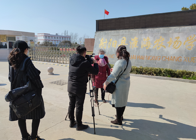 吳校長從事教育事業一輩子,不但經常獲得優秀教師、先進工作者、優秀共產黨員外,在2017年9月,還獲得中華人民共和國教育部、中華人民共和國人力資源和社會保障部頒發的鄉村學校從教30年榮譽證書,以表彰她在鄉村教育事業上所作的貢獻。圖為射陽縣融媒體中心有采訪吳文英時的鏡頭。