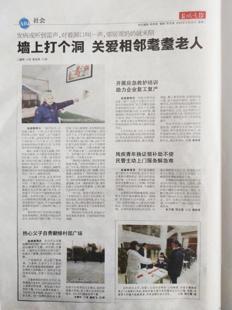 打開鹽城晚報2020年4月28日四版,只見頭條上通欄刊載了一條《發病或聽到雷聲,對著洞口叫一聲,鄰居周奶奶就來陪墻上打個洞,關愛相鄰耄耋老人》的文章,特別是文章中一個老人指著墻上洞口的照片,更是讓人感到這個洞口肯定有故事,果然在文章中,我們通過這個叫許愛蘭老人的講述,從而揭開了鄰居周懷貴老人多年人照顧鄰居的感人故事。圍繞這個洞口的角度,彰顯著人間的大愛。