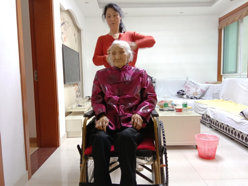 據周元兵講,他另外的五個哥哥姐姐們或是嫂子女婿們,個個對母親照顧有加,樣樣為老人考慮周到,溫暖的家庭氛圍,這也是我的母親長壽的一種秘訣吧。圖為周粉英在照顧母親時的一些畫面。