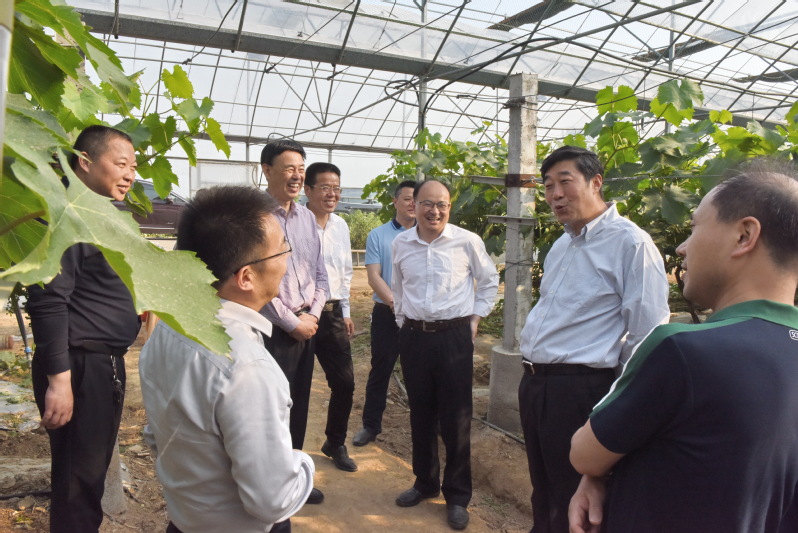 胡兆輝在淮海高效種植園區參觀,連棟大棚內青翠的葡萄架下掛滿了葡萄。他信步走上前去察看葡萄的長勢情況,并詳細詢問了葡萄的品種及市場生產銷售情況,以及淮海其他瓜果苗木的生產情況。他要求,淮海要在產品質量提升、品牌包裝和市場拓展上下功夫,爭取創造更大的市場。