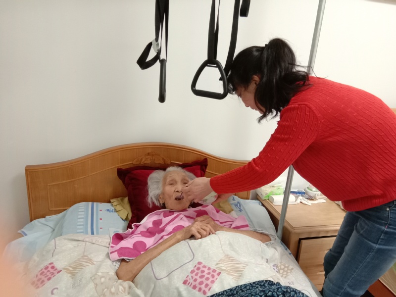 丁吉女在90歲那年,一次她在上廁所跨籬笆時,右腿跌斷了,在家床上躺了好一陣子。到了98歲那年,一次早上下床時,腳被褲子拌了一下,從床上栽了下來,又造成了右大腿骨骨折,至此,她便臥床不起,在輪到二女兒周粉英陪護時,她就擱張床睡在老媽媽旁邊,方便夜里照顧老人,把老太照料得干干凈凈,鄰居無人不夸這個孝順的女兒。