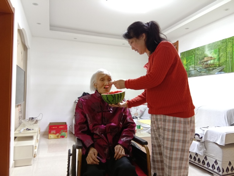 “媽,你看新鮮的西瓜上市了,來,我喂給你品嘗下!”在鹽城市區一戶人家的樓房里,飄過歡聲笑語,已經退休多年的二女兒正給母親在家中吃著西瓜。他們就是當地有名的孝順家庭周粉英和她的百歲母親丁吉女一家。
