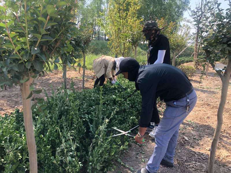 “小許、小倪,新移植的大葉黃楊球在定植前后,要疏除部分枝條,防止水分過度蒸發和根系袖手水分不良之間的矛盾,但疏除量不要太大,以疏除黃楊枝條的三分之一甚好?!敝行穆番F場林發公司總經理助理蔡仿一邊參與修剪一邊手把手教小同事。