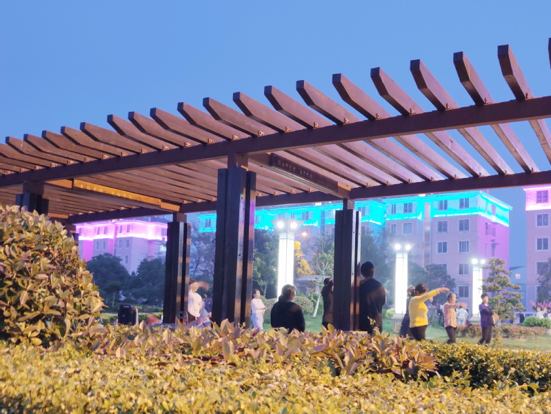 隨著夏季的來臨,每當人們吃完晚飯,在淮海農場淮海公園內就是別樣的風景。這時晚霞余輝西下,夜幕降臨,公園內變幻的燈光閃爍,色彩斑斕,讓公園內的綠植、設施和燈光融合在一起,非常漂亮。