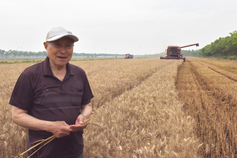 在三分場社區22大隊小麥收割現場,當已經是80歲高齡的原淮海農場農機科科長江仁良,當他看到一輛凱期收割機在田間快速收割小麥的鏡頭時,有著濃厚農機情結的他,剛從觀光車上下來,就連忙跨過防滲渠,信步來到小麥收割的田間,跟著收割機的身后,蹲下身來,撥開麥秸,用嘴吹了會兒,然后滿意地站了起來,又徑直來到站立的麥子前,輕扶麥穗查看穗子的大小,抬著看著行進中的收割機,臉上露出了欣慰的歡笑??吹贸隼限r機科長對現代農業機械的發展很是滿意。