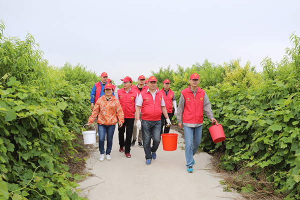 6月11日,臨海農場百果園里熱鬧非凡,由農場公司機關第一黨支部全體黨員、青年志愿者組成的采摘團,正在幫助綠農園公司采摘油桃。