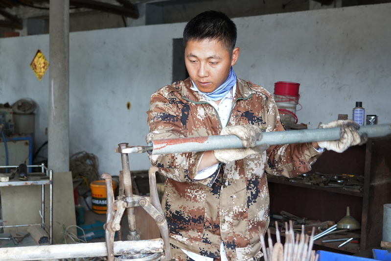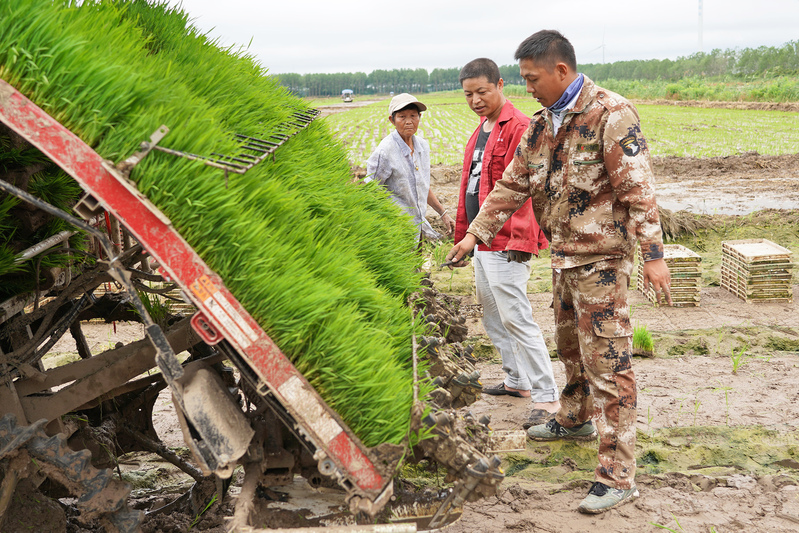 趁著插秧機駕駛員中午吃飯的空擋,蔡金放下手上農機修理的活又趕到了第五生產區17連16號田間,檢查插秧機的狀況。擦去秧針上的爛泥,用尺將三臺插秧機的機針一根根量過去?!敖裉煅磲樁紦Q過了嗎”?“全換過了”?!皺C上有三根針磨損嚴重啊”!“今天在田里碰到石頭了”。“你機上的針根本就不是我發給你的那種”?!拔疫@是機上原裝的,能多用幾天”?!叭_機,趕緊都換了再下田插”!昨天要求插秧機駕駛員將秧針全部換了再插,面對駕駛員的推搪之詞,蔡金干凈利落地將每一臺插秧機的取苗情況檢查了一遍。