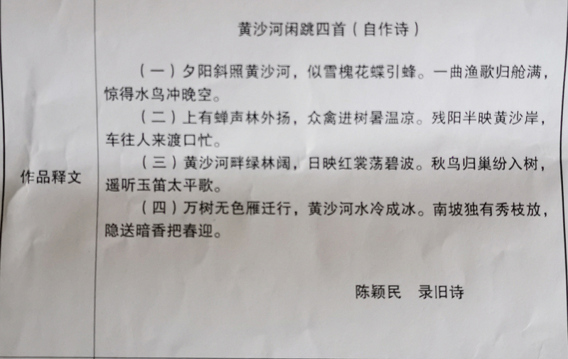 近日,新洋資深書畫愛好者陳穎明的一副詩書作品《黃沙河閑跳四首》,生動描繪了北枕黃沙河的新洋農場生態秀麗的迷人風貌。