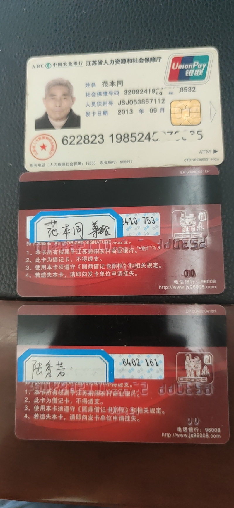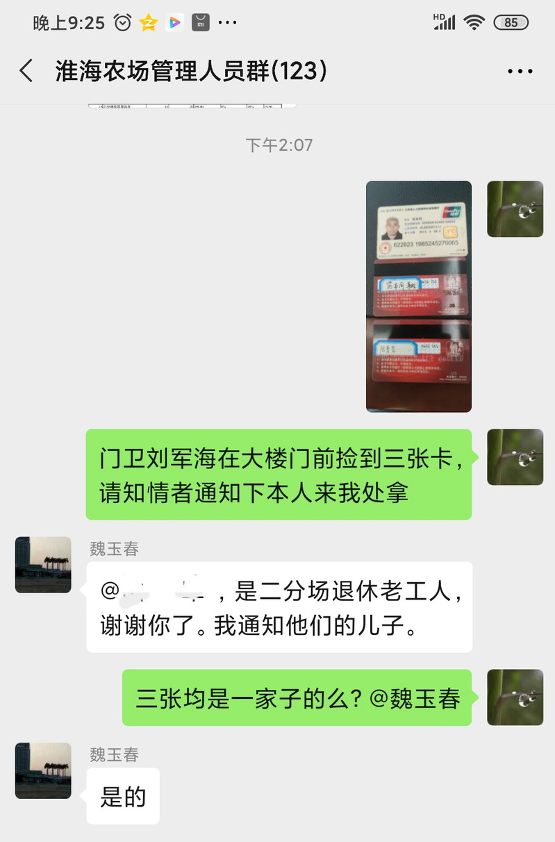 對劉軍兵的善舉,我們表示了肯定,于是立即就把這三張卡拍了照,上傳至淮海農場管理人員工作群中,并注明請認識丟失卡的同志進行轉告。迅即,二分場干事魏玉春看到信息后,就有了回應,說丟失卡的人是他們二分場社區的,已經通知老人的兒子前來認領。