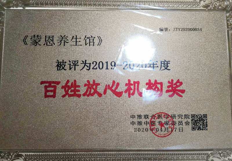 近日,新洋農場退休職工柳金寶的“蒙恩養生館被中推聯合醫學研究會、中推中醫專家委員會評為2019-2020年度“百姓放心機構獎”。