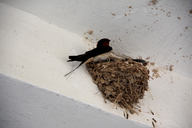 春天,燕子從南方飛來,成對的燕子銜來泥草在屋檐下做起了小窩,初夏或仲夏就孵化出了小燕子,每天有一只燕子守窩,一只燕子飛出去覓食銜回來喂小燕子。小燕子等食時把頭伸出窩外,張著黃黃的小嘴嘰嘰喳喳叫著,就像一曲動聽的小曲,引得住戶和路人駐足聆聽和觀望。看老燕子來回輕盈地飛舞,不時地停在窩前把所覓之食喂給小燕子,是一種享受,是一種陶醉。店主喜歡燕子在他的屋檐下做窩,說是能招來財運,故不允許任何人破壞燕窩的。