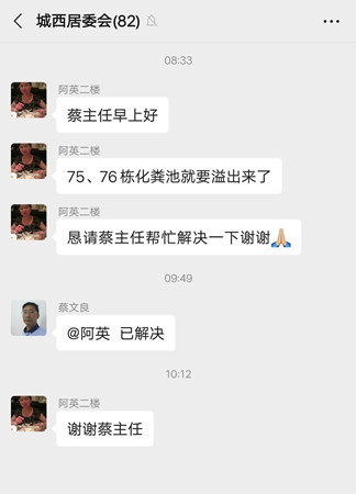 “蔡主任早上好,75、76棟化糞池就要溢出來了,懇請幫忙解決一下,謝謝。”7月27日早上8點半,新洋農場城西居委會微信群里,居民向居委會主任求助。