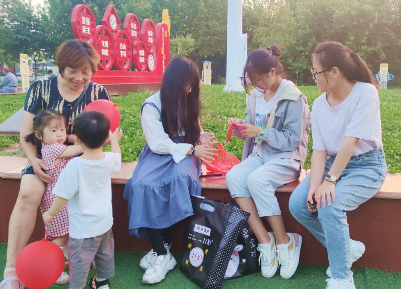 9月4日傍晚,在淮海農場職工休閑體育運動廣場健身器材包裹的橢圓形的大理石上,由淮海農場中學的三名學生正坐在上面一邊吹著氣球、一邊把色彩斑斕的氣球或是氣棒派送到前來索要的寶媽寶奶或是寶寶的手中,并以此來鍛煉體驗與社會交往的能力,并在人際交往中奉獻愛心,體味人性的溫暖。