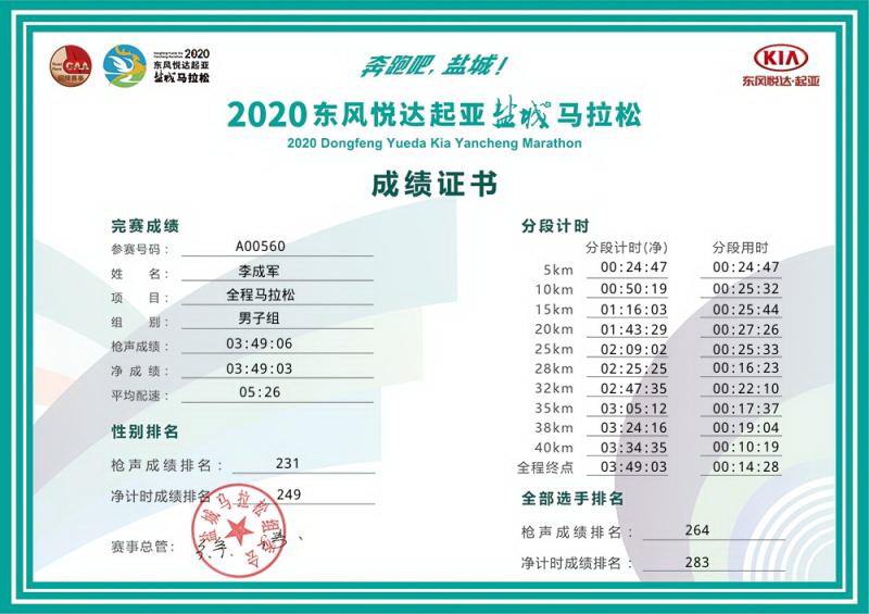 在本次2020鹽城馬拉松比賽中,男子全程馬拉松選手李成軍以凈計時排名249,凈成績3小時49分零3秒的時長和5分26秒每公里配速;男女半程馬拉松選手高善文、辛道紅分別以66名、313名的凈計時排名,1小時34分36秒和2小時12分26秒的凈成績,4分29秒和6分17秒每公里的配速,讓農場參與馬拉松比賽的不少跑者自嘆不如。