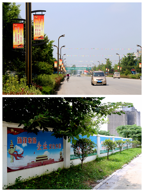 緯四路是新洋小鎮的主要大街,也是黃興路(黃沙港至興橋)的主要路段,這里車來人往十分繁忙,馬路十分寬闊,路燈、紅綠燈、攝像頭等配套設施齊全。更有文化韻味的是道路兩旁的燈箱宣傳牌和路燈桿上宣傳牌,每隔一段距離還豎有巨大的平面宣傳牌。宣傳牌上是有關政治、文化、精神文明建設方面的宣傳內容,燈箱里布置的是職工拍攝的有關農場公司的美麗景色的巨幅照片……這些大、中、小的宣傳牌組成了立體化宣傳態勢,將新洋文化展現在路人面前,彰顯了新洋的文化底蘊。