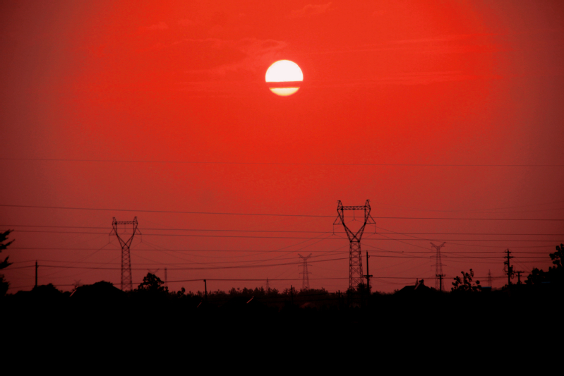 太陽越來越大,由橘紅、微紅、深紅到大紅,越來越紅,紅彤彤的,血紅血紅的。