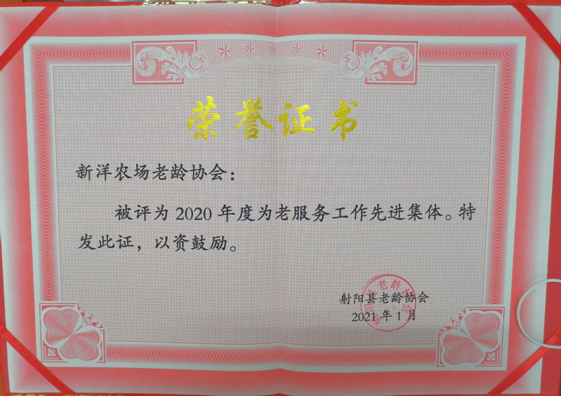 新洋居家養老服務中心始終以“以老服務”為宗旨,從老年人的日常生活和精神需求出發,全力解決老年人的緊急救援、日常照料、精神慰藉等諸多服務,得到了場域老人的一致好評,也贏得了上級相關部門的充分肯定。在2020年度射陽縣為老服務工作表彰大會上,新洋榮獲“2020年度為老服務先進集體”稱號。老年工作得到了縣老齡協會的特別表揚。