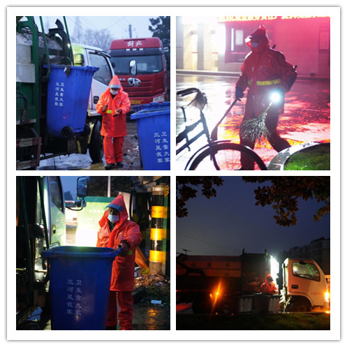 3月19日凌晨五點,三河街道兩側的垃圾轉運點,一閃一閃的車燈雙跳尤其亮眼,車燈,手電筒燈光,桔黃色的環衛衣交織成一道光的風景。