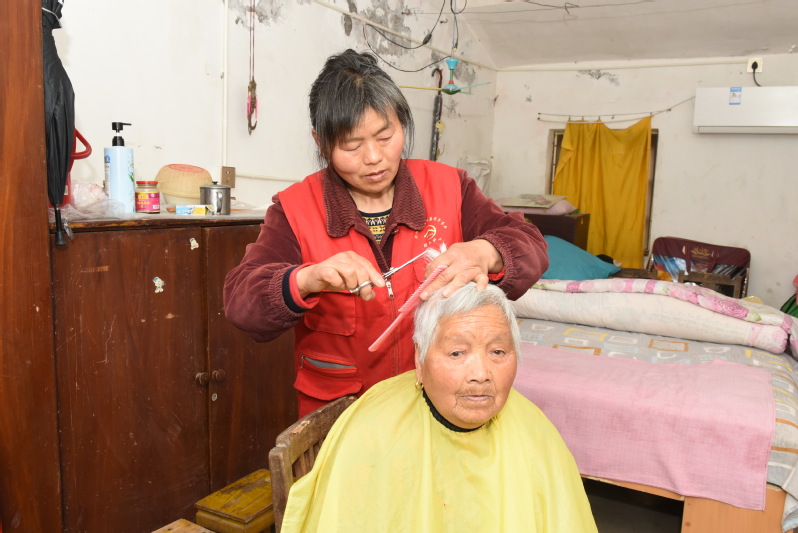 4月29日下午3時許,家住淮海農場振興小區82歲的居民施維琴老人感覺十分清爽,因為淮海農場居家養老志愿服務人員張榮芳,對她的頭發好好地修剪了一番。