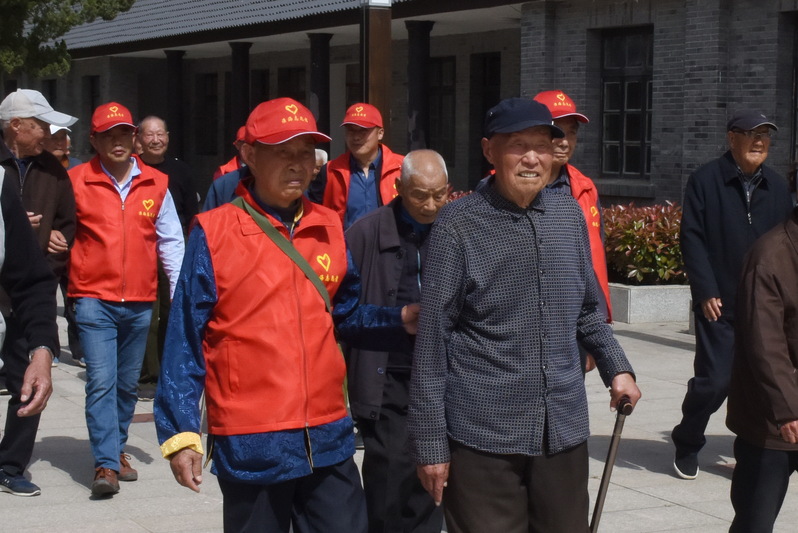 5月8日下午2點多鐘,一名剛跨入80歲這個耄耋年齡段的黨員林耀國,以淮海農場社區城西居委會黨支部的一名志愿者的身份,陪伴性地攙著一位95歲的老軍墾戰士魏廣友,同其他15名平均年齡達90歲的原中國人民解放軍農業建設第四師的老戰士們一起,來到城西支部上黨史學習教育課,課后并到當年的農建四師師部舊址上,瞻仰紀念碑、聆聽主席令、參觀陳列館,幫助老軍墾在尋找、敘說曾經的記憶和榮耀過程中,踐行黨的歷史,并以此來不忘初心,牢記使命,更好地講好淮海紅色故事,傳承好農建四師精神,讓軍墾精神在淮海農場大地上發揚光大。圖為穿著志愿者服裝的林耀國老人在陪伴老人行進時的鏡頭。