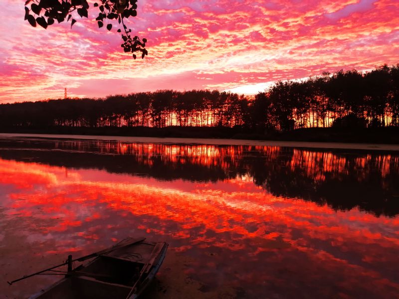 落日的余輝映照在蒼穹的大地上,天際一片輝煌,飄蕩在空中的浮云,已不再是純潔雪白的,而是緋紅緋紅的,色彩絢麗明媚。天空是紅的,河水是紅的,通紅通紅的,紅得透亮透亮,紅得讓人陶醉,真可謂:“殘?jiān)苼y渡染紅天,霞光萬道映大河。”