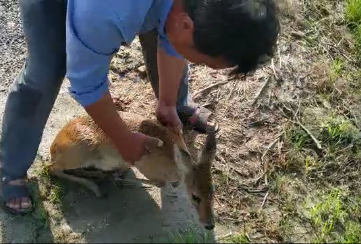 7月10日早上六點(diǎn)半,蘇墾農(nóng)發(fā)弶港分公司第一生產(chǎn)區(qū)2連大渠正在抽水灌溉,2大隊(duì)隊(duì)長陳兵在田間踏田檢查時(shí)聽到渠道中有動物的叫聲,走近一看,發(fā)現(xiàn)一只獐在渠道里不斷掙扎,聲嘶力竭,隨時(shí)有生命危險(xiǎn)。見此情景,陳兵立即組織人手拿來繩子、框子、網(wǎng)等工具,經(jīng)過半小時(shí)的努力,終于成功地將獐搶救上岸。通過報(bào)警求助,警察連線咨詢了野生動物保護(hù)中心,在專業(yè)人士的指導(dǎo)下,陳兵對獐進(jìn)行了簡單檢查和救護(hù),發(fā)現(xiàn)野生獐沒有大礙,立即將其放生。