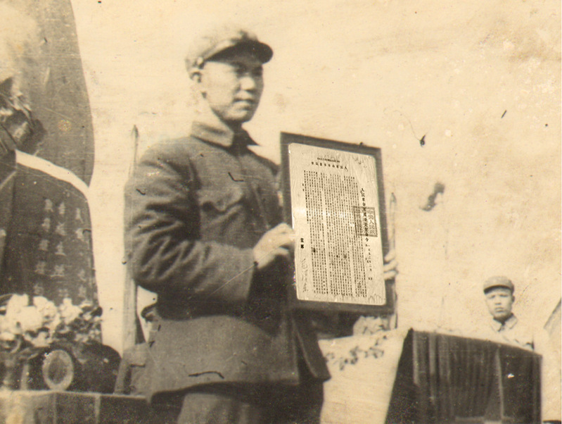 圖為中國(guó)人民解放軍步兵第102師副師長(zhǎng)李桂蓮在海門縣三廠鎮(zhèn)接受命令時(shí)的鏡頭。
