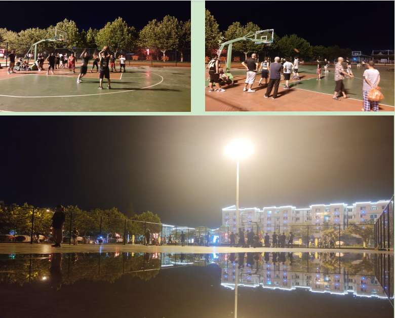 如今,天天火爆的籃球比賽成為淮海職工居民熱身運動的新常態(tài),就連農(nóng)場許多的學生甚至是孩童也拍著籃球進場投籃,籃球健身的良好氛圍,正為淮海健康體育運動注入了新的活力。圖為夜幕下的籃球運動場上職工居民追逐時的鏡頭。