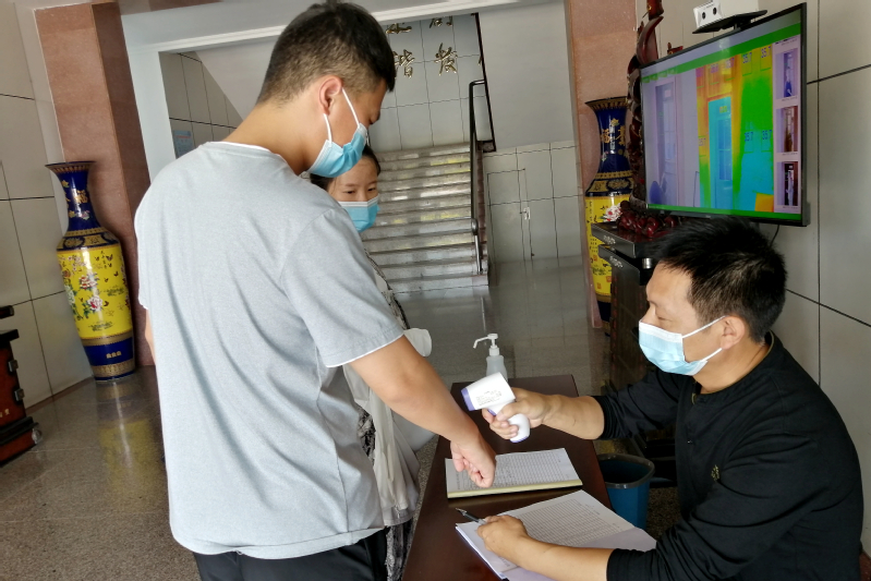 圖為農(nóng)場機關(guān)工作人員上班接受體溫檢測