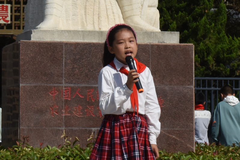 “各位同學(xué),早上好,歡迎大家到我們農(nóng)建四師陳列館參觀!我是淮海農(nóng)場學(xué)校二年級學(xué)生于曉冉,也是我們陳列館的編外義務(wù)講解員,下面就由我來給大家介紹我們館的紀(jì)念碑白玉雕像……”9月28日上午,淮海農(nóng)場小學(xué)二年級于曉冉,她作為農(nóng)建四師的紅色小小講解員,開啟了為學(xué)校學(xué)生講述發(fā)生在農(nóng)建四師軍墾傳統(tǒng)的紅色故事。