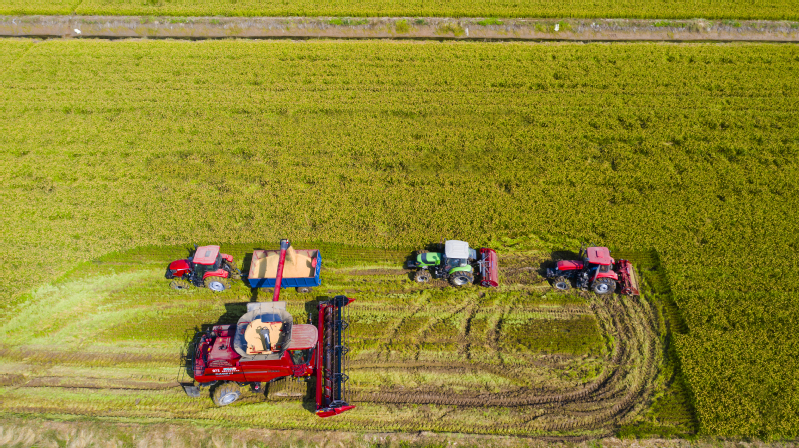 高空俯瞰,新洋的稻田格外俊俏,廣大干群正搶抓晴好天氣,組織人力、農(nóng)機(jī),加緊收割水稻,一臺(tái)臺(tái)大型聯(lián)合收割機(jī)開足馬力穿梭田間,所到之處,水稻盡數(shù)倒下,切割、脫粒、粉碎秸稈一氣呵成,吐出的稻谷顆粒飽滿,空氣中彌漫著陣陣稻香,好一副醉美田園風(fēng)光!