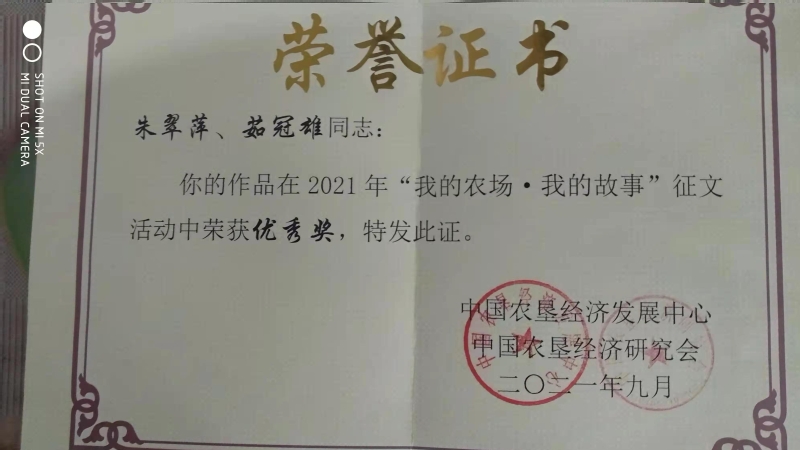 近日,弶港農(nóng)場杜鵑居委會黨員朱翠萍、茹冠雄夫婦收到了中國農(nóng)墾經(jīng)濟(jì)發(fā)展中心,中國農(nóng)墾經(jīng)濟(jì)研究會寄來的2021年“我的農(nóng)場,我的故事”征文獲獎榮譽(yù)證書。