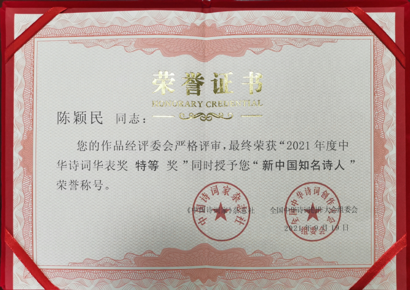 新洋農(nóng)場退休職工陳穎民在全國中華詩詞創(chuàng)作大會組委會舉辦的中華詩詞華表獎(jiǎng)中,獲得“特等獎(jiǎng)”并被授予“新中國知名詩人”榮譽(yù)稱號。
