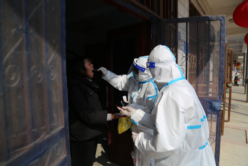 3月5日,連云港市海州區(qū)通報(bào)發(fā)生新冠肺炎疫情,形勢(shì)十分嚴(yán)峻。崗埠上下迅速行動(dòng)起來,按照要求組織開展全員核酸檢測(cè)。全員核酸檢測(cè)要求一天內(nèi)對(duì)崗埠所有在家人員進(jìn)行檢測(cè),農(nóng)場(chǎng)四個(gè)點(diǎn)位同時(shí)開始,負(fù)責(zé)檢測(cè)的人員特別緊張。馬素蓮得知這一情況,主動(dòng)和相關(guān)人員溝通,暫停了自家門診,帶領(lǐng)醫(yī)生錢冬梅、護(hù)士錢明霞加入了振興廣場(chǎng)籃球場(chǎng)監(jiān)測(cè)點(diǎn)的核酸檢測(cè)人員隊(duì)伍。從3月5日到11日,她們?nèi)艘恢眻?jiān)守在核酸檢測(cè)一線,每天檢測(cè)人員合計(jì)達(dá)到兩三千人。有時(shí)候,她們需要配合網(wǎng)格員深入鎮(zhèn)區(qū)、生產(chǎn)區(qū)各居委會(huì)上門為行動(dòng)不便的人員進(jìn)行采樣,足跡遍布大街小巷,密不透風(fēng)的防護(hù)服常常讓她們滿臉通紅透不過氣來。護(hù)士錢明霞告訴筆者,3月11日當(dāng)天,她負(fù)責(zé)部分小區(qū)的核酸采樣工作,光是6樓就爬了6次,腿最后跟灌了鉛一樣,挪不動(dòng)。“有時(shí)候晚上嘴里吃著東西就睡著了。”