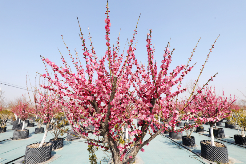 春意漸濃,和煦三月。甫一進(jìn)入容器苗基地,便會(huì)被一顆造型奇特、年代感十足的海桐所吸引,曲音婉轉(zhuǎn)的鳥(niǎo)鳴聲不僅愉悅了聽(tīng)覺(jué),跟著風(fēng)遞來(lái)的暗香,還能尋得一大片滿目映紅、花香撲鼻、爛漫嬌艷的紅梅,這便是新洋容器苗基地內(nèi)正爛漫的“梅”景。