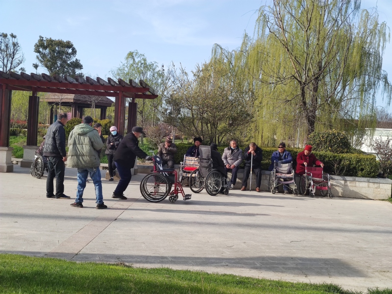 我們發(fā)現(xiàn),來這里休憩的老人中,推著輪椅來的老人特別的多,這些老人中,有自己轉著輪椅過來的,也有兒女推著他們過來的。“我爸總是讓我將他推到公園中來,他就喜歡與同齡人在一起熱鬧熱鬧,這樣他的心情才舒暢。”胡鐵成的兒子將老人推到公園坐椅著時對我說,“老人怎么說怎么好,我們做兒女的,滿足下他們的心愿就好了。圖為老人們在一起交談時的鏡頭。